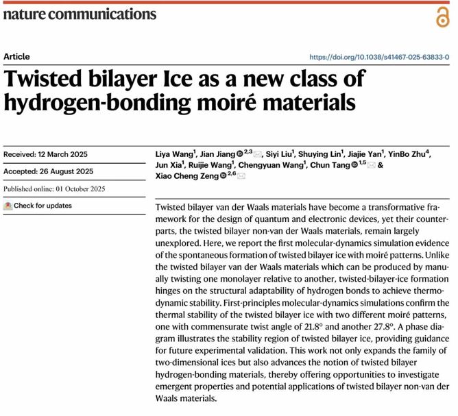 近日,土木工程与力学学院微纳米力学团队唐淳教授、王丽雅副教授与香港城市大学曾晓成教授团队合作,发现氢键主导的非范德华摩尔材料:魔角双层冰,在国际著名期刊Nature Communications上发表题为Twisted bilayer ice as a new class of hydrogen-bonding moiré materials的论文。BB网页版为第一完成单位,王丽雅为论文第一作者,香港城市大学江健博士、BB网页版唐淳和香港城市大学曾晓成为共同通讯作者。
